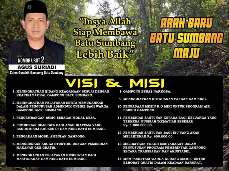 Aceh Timur – Dari sebuah desa di hulu Kecamatan Simpang Jernih, suara perubahan perlahan-lahan mulai terdengar. Desa Batu Sumbang, yang selama ini nyaris luput dari perhatian media dan kebijakan besar kabupaten, kini tengah bersiap menyambut momentum enam tahunan: pemilihan Geuchik. Dalam hiruk pikuk pesta demokrasi lokal itu, satu nama mengemuka—Agus Suryadi. Bukan sekadar kandidat, tetapi pembawa gagasan yang mencoba mendefinisikan ulang peran seorang kepala desa di tengah realitas sosial yang kompleks.